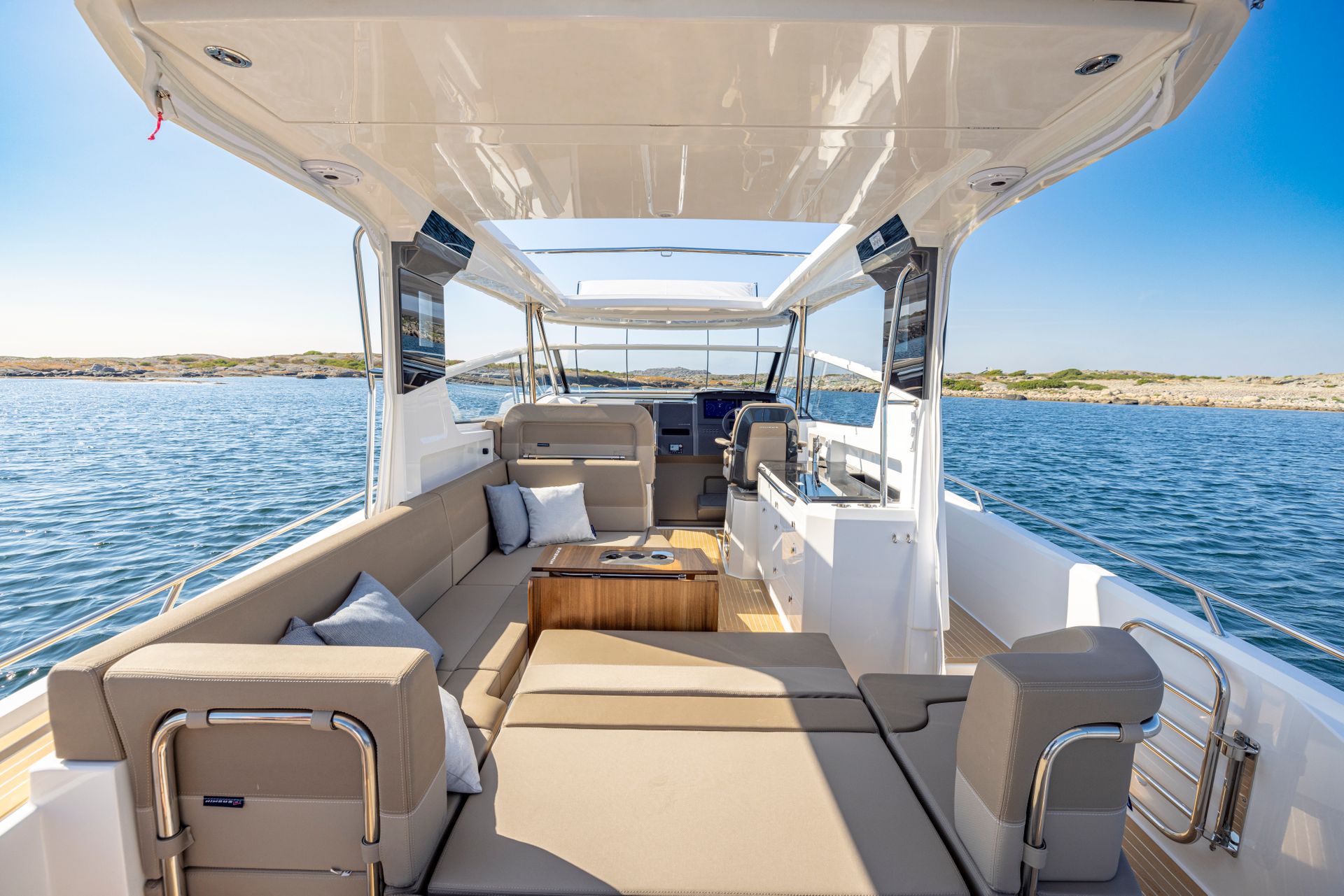 The cockpit of the W11, similar to the W9, offers superior protection with a large window screen and seating for three. The standard open boat is equipped with a targa, but an optional large electric sun-top similar to that of the T11 can also be added.